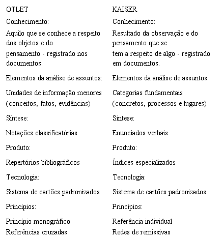Com base no quadro exposto acima, é possível verificar que, embora Otlet e Kaiser tenham adotado signos distintos para comporem suas sínteses (Otlet - notações classificatórias e Kaiser - enunciados verbais), ambos convergiam em todas as demais variáveis analisadas. Tanto Otlet quanto Kaiser lidavam com um conhecimento necessariamente registrado em algum documento. Há que se ressaltar que o conceito de documento de Otlet transcendia a questão do item bibliográfico. Conforme exposto, ambos trabalharam suas dimensões analíticas com base em partes informativas menores contidas nos assuntos dos documentos. Vale destacar que Kaiser, neste quesito, apresentou um caráter mais teórico que Otlet, uma vez que definiu categorias semânticas que serviam como princípios teóricos gerais para conduzir a análise de todo e qualquer assunto. O esclarecimento dado por Kaiser para a questão das categorias parece mais elaborado que a explicação dada por Otlet para definir as unidades menores de informação. Ao passo que Kaiser trata suas categorias como princípios teóricos, Otlet aborda suas unidades de informação como partes informativas de conteúdos.