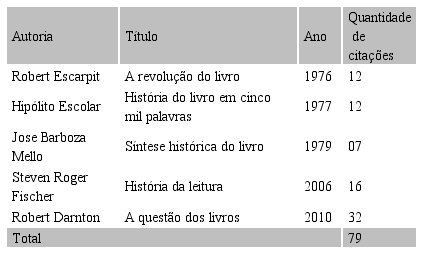 Foram extraídas 79 citações nesses cinco livros, a partir de sete categorias de análise: ‘imprensa’, ‘tiragem’, ‘comércio’, ‘poder’, ‘formato’, ‘leitura’ e ‘percepções’.