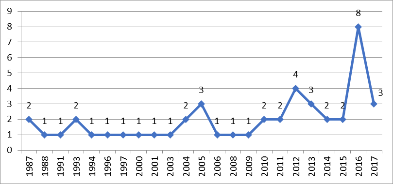 A Figura 1 exibe a distribuição temporal das teses doutorais cobrindo um período compreendido entre 1987 e 2017, sendo que foi constatada ausência de teses doutorais sobre a temática pesquisada nos anos de 1989 e 1990, 1992, 1998 e 1999, e em 2002.