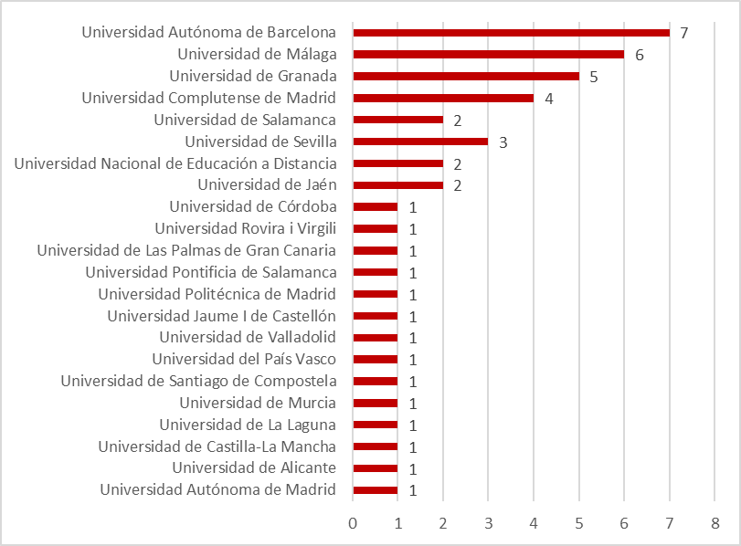 Em relação à vinculação institucional das teses evidencia-se a liderança de três universidades: Barcelona, Málaga, Granada e a Complutense de Madrid, sendo esta última uma das universidades mais prestigiadas da Espanha e com forte tradição na formação de professores e ensino para a diversidade.