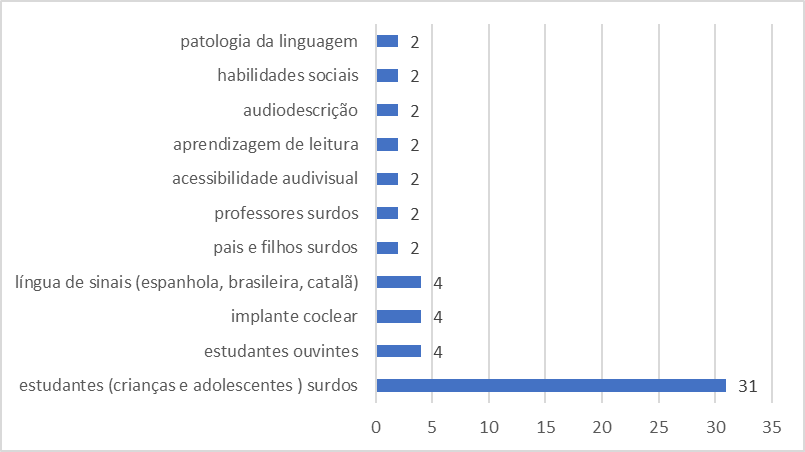 Sobre a distribuição das teses por área de conhecimento, os resultados expressaram a forte presença das áreas de Psicologia e Educação demonstrando a supremacia das áreas de Ciências Humanas nos estudos sobre educação de surdos. Acerca da distribuição das teses segundo as temáticas abordadas, extraídas das palavras-chave atribuídas pelos autores, observa-se que as temáticas ligadas à área da “Educação” englobaram “estudantes surdos”, “educação de surdos”, “professoras surdas” e “estudantes ouvintes”. Um número expressivo também foi encontrado na temática relacionada à área da Comunicação, envolvendo as abordagens comunicativas utilizadas com estes alunos surdos, além da área da Saúde e de um total expressivo de diferentes temáticas em outras áreas do conhecimento.