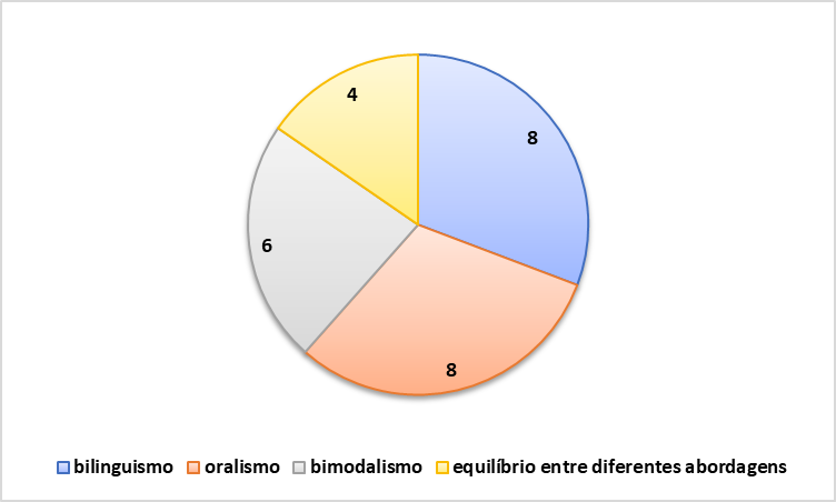 As abordagens predominantes do bilinguismo (n=8) e oralismo (n=8) reuniu 61,4% das teses. Na educação de surdos, segundo Lacerda (1998) o bilinguismo consiste na ideia de que a língua de sinais é a língua natural dos surdos, que, mesmo sem ouvir, podem desenvolver plenamente uma língua visogestual. De acordo com essa visão a língua de sinais é encarada como língua materna do surdo e a língua oral/escrita como sua segunda língua.