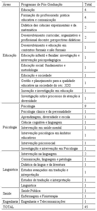 Nessas 22 universidades há uma diversidade de programas de pós-graduação (n=28) nos quais as teses sobre educação de surdos foram defendidas em diferentes áreas (n=5), conforme apontam os dados da Tabela 1.