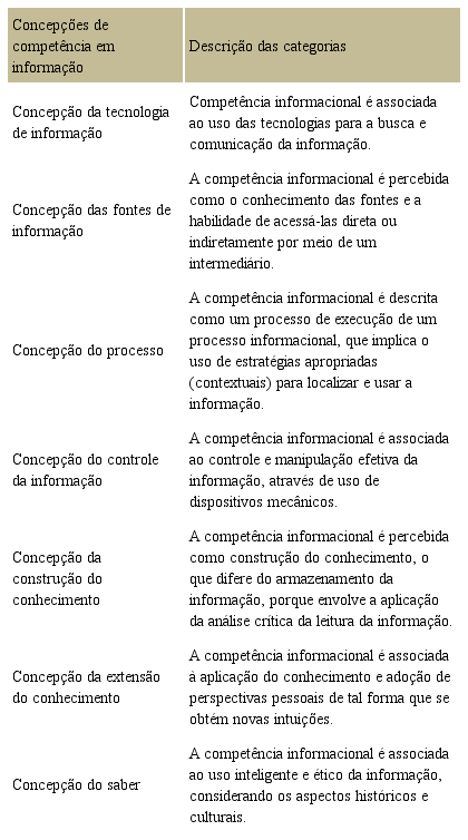 Essa compreensão pode gerar dois níveis de aprendizagem: uma superficial, que se relaciona às primeiras categorias, e outra profunda, que reporta às últimas categorias. Esse processo é fundamental para a intervenção educacional, pois o conhecimento dessas categorias por parte dos professores, bibliotecários e de outros agentes educacionais pode contribuir para a reformulação das formas como se ensina e/ou se aprende a competência informacional nos diversos programas educacionais.