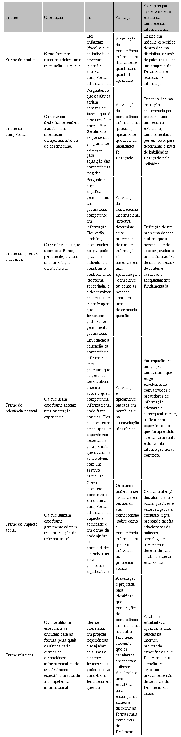 Estes frames foram desenvolvidos como uma ferramenta conceitual para ajudar a todos os envolvidos no ensino da competência informacional a analisar e a refletir sobre a variedade de influências teóricas implícitas ou explícitas que interferem na abordagem deste objeto (BRUCE; EDWARDS; LUPTON, 2006).