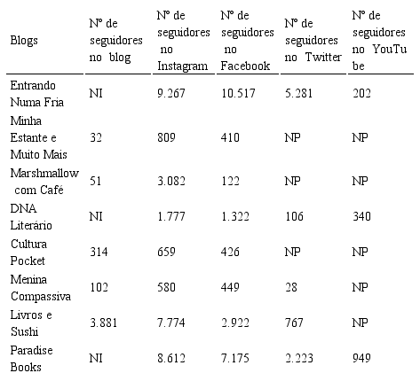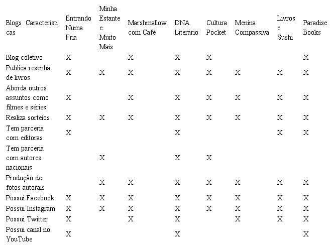Fonte: Blogs elencados, Instagram, Facebook, Twitter e YouTube adaptados pelos autores.Em relação ao conteúdo foram identificados alguns tópicos semelhantes que caracterizam os blogs literários analisados como: a existência blogs coletivos; a publicação de resenhas de livros; a abordagem de assuntos relacionados à literatura, como filmes e séries; a realização de sorteios; as parcerias com editoras e autores nacionais; a produção de fotografias autorais e intensa presença das blogueiras nas redes sociais (Instagram, Facebook, Twitter, YouTube), conforme apresentado no Tabela 2.