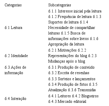 Em escrita de resenhas (6.3.2) compreende-se a relação das blogueiras com a escrita e a produção das resenhas críticas, processo permeado por várias questões: a leitura do livro; a organização das ideias; o ato de escrever em si, com as preocupações com as normas da língua portuguesa; a edição do texto; a revisão; a expressão dos sentimentos; a emissão de opiniões, a exposição da blogueira; a transmissão de informações.