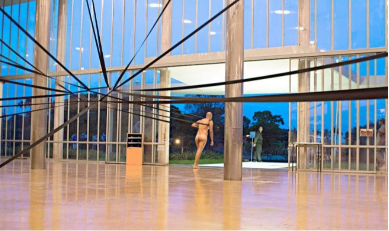 Bem na entrada, estava Puxador (1998), em versão feita especialmente para a Pampulha, a puxar a colunata metálica do ex-Cassino para o lado de fora, como quem persegue o colapso (impossível, mas potencial) do edifício. Por se tratar de obra que continha nudez, convencionou-se que o “puxador” ficaria posicionado no exato limite entre o interior e o exterior do prédio, mas justamente na passagem do visitante. (MOURA, 2018).