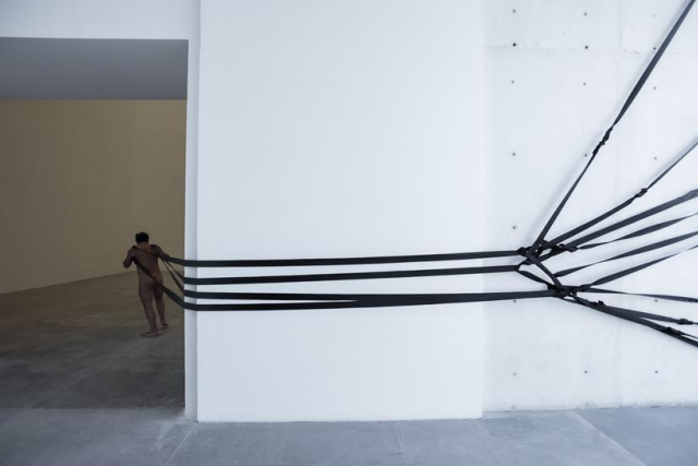 Fonte: Fotografia de Oliver Santada, adaptado de Tanya Bonakdar Gallery (2018).É possível traçar uma similaridade entre as edições aqui apresentadas. De acordo com Lima (2018) [23], uma aproximação comum entre os trabalhos advém do fato de que apenas homens podem performá-los. A artista compreende que há um sentido de força da humanidade ligada a essa ideia masculina do músculo, arquetípica. De fato, essa é uma das exigências que se vincula à instrução de que os homens escolhidos não sejam fisicamente fortes ou fracos, apontando a escolha de homens com porte físico ordinário.