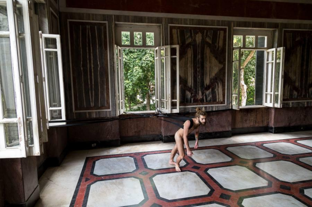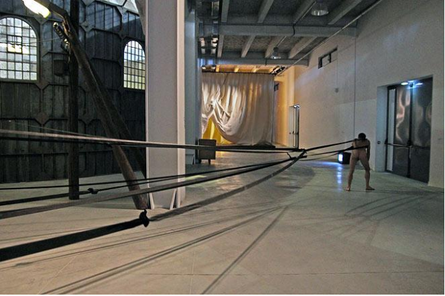 Contudo, apesar de a edição Puxador-Colunas ter sido projetada, como acreditou Moura (2018), especialmente para o Museu de Arte da Pampulha, Lima apresentou a edição na Bienal de Lyon, na França, em 2011 (Figuras 9 e 10). Nessa versão, a artista utilizou as colunas do grande salão do Sucrière, um antigo depósito nas margens do rio Ródano. Além disso, designou a ação a dois performers gêmeos, Emmanuel e Étienne Borgo, que proporcionaram um novo aspecto para a obra, uma vez que o público sempre imaginava se tratar do mesmo homem. À época, a obra veio a ser divulgada apenas como “Puxador”, mas Lima afirma que se trata de uma variante da edição Puxador-Colunas: “[...] foram as únicas duas vezes que esse trabalho foi exposto até agora, em 2002 na Pampulha e em 2011 na Bienal de Lyon” (LIMA, 2018)[21].