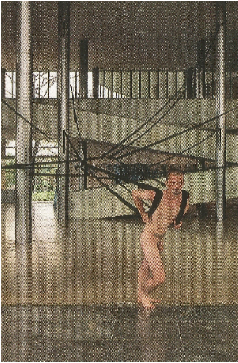 O vídeo presente na documentação museológica, de autoria de Joacélio Batista, com aproximadamente quatro minutos de duração, registra alguns momentos da obra no espaço expositivo. Nele é possível ver o performer puxando as alças presas em seus ombros. As imagens em questão se concentram grande parte das vezes sob a perspectiva de dentro para fora do museu, na qual é possível notar a reação dos visitantes ao se deparar com a performance quando adentram o local. Ademais, de acordo com a conservadora do museu, Luciana Bonadio, os curadores editaram as imagens colhidas da performance e exibiram-nas nos demais dias da exposição. Como ferramenta de comunicação museológica, o catálogo também fornece informações essenciais sobre essa reexibição. É nele que encontramos a informação de que a performance foi realizada apenas no dia da abertura da mostra, por um período de três horas pelo performer Tiago Macedo (Figura 3).