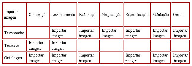 A seguir serão apresentados os resultados da análise realizada, a qual permitiu identificar em qual etapa do processo da Engenharia de Requisitos, cada um dos diferentes sistemas de organização do conhecimento pode ser implementado. O Quadro 1 apresenta, por meio de uma matriz de relacionamentos, a síntese dos resultados, sendo que, logo após, são apresentadas as análises para cada umas das associações identificadas.