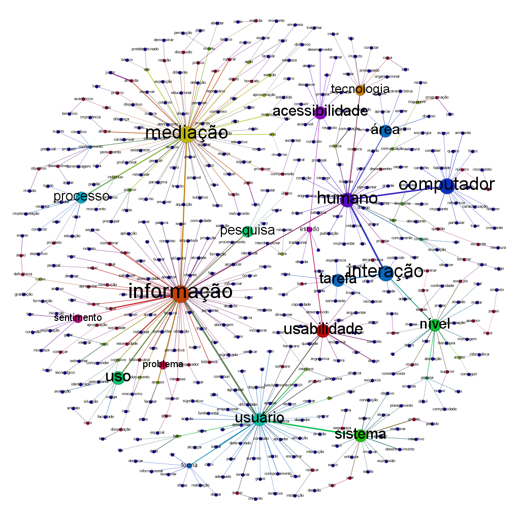 A figura 2, a seguir, traz o grafo representativo da rede sobre Interação, Interface, Usabilidade e Mediação da Informação. Como pode ser observado, os temas são bastante diversificados e bem distribuídos, formando subgrafos a partir de nós específicos, e há conexões entre os nós mais centrais da rede. O destaque para essa rede é a ausência de um único nó que concentrasse a distribuição de todo fluxo de informação e respondesse pela manutenção da integridade da rede. A análise visual do grafo também indica os caminhos necessários para conectar os temas principais, sendo possível perceber as ligações estabelecidas entre os nós mais conectados da rede.