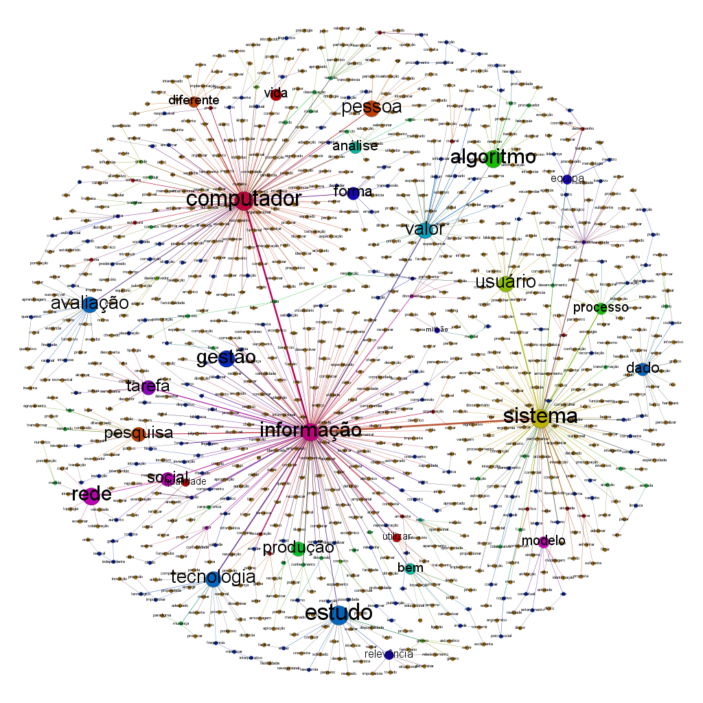 A transição entre componentes de Tecnologias da Informação e outros componentes como sistemas de informação, Avaliação de Sistemas e de Informações, ou ainda sobre Recuperação da Informação, torna-se dependente desses nós. Assim, tomando como referência os componentes conectados, para verificar e analisar o uso de sistemas de informação, destaca-se a necessidade de considerar os nós que ligam os diversos componentes do grafo, sob o risco de verificar apenas os temas a partir de seus subgrafos isolados. O grafo apresentado na figura 3, a seguir, traz a representação da rede sobre Tecnologias, Sistemas, Avaliação e Recuperação da Informação; nele é possível verificar a diversidade de temas e visualizar a organização dos nós mais centrais da rede. Também é possível verificar a importância de cada um dos temas a partir das ligações que eles mantêm com nós menos conectados. São esses nós, ao redor dos nós principais, que os caracterizam, conferindo qualidades específicas ao nó principal, tornando possível, à medida que são acionados, o mapeamento e a visibilidade das questões e problemas que o campo temático apresenta e que necessitam de resolução a partir de pesquisas e investigações.