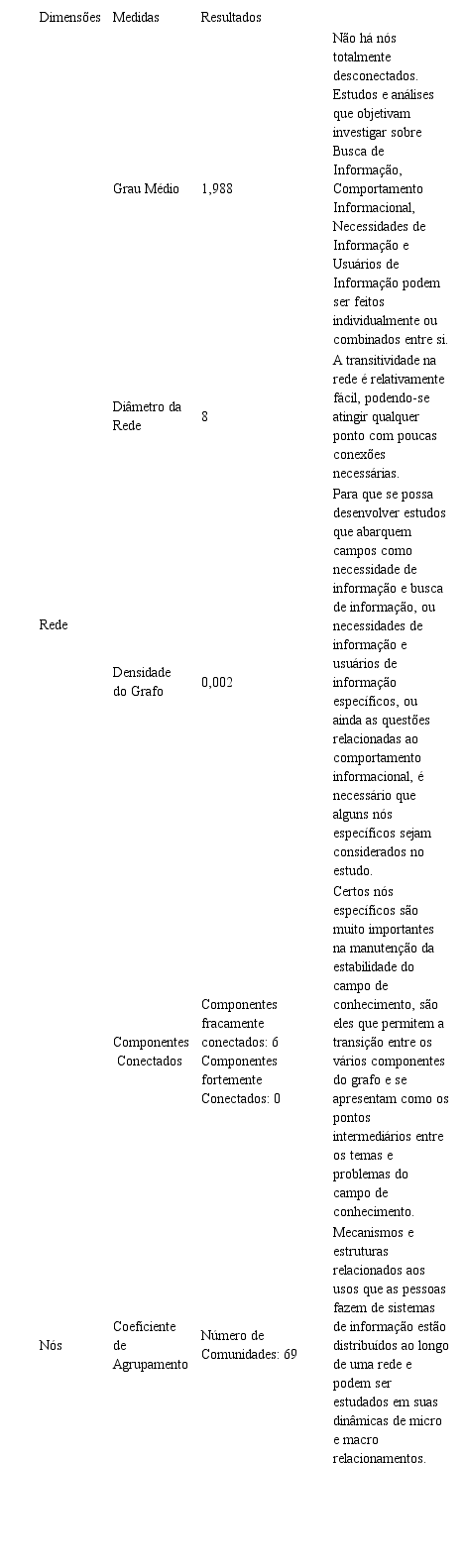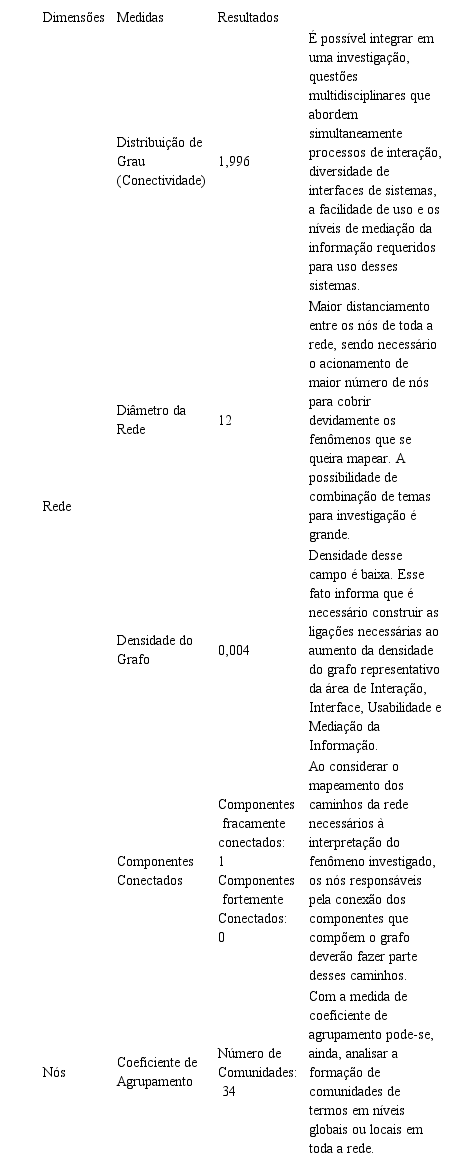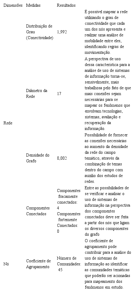 Os resultados encontrados a partir das medidas de redes definidas neste trabalho encontram-se agrupadas na tabela abaixo. Os estudos de redes e o estudo das representações gráficas dessas redes a partir dos grafos contam com uma variedade bastante grande de medidas de análise. A princípio, todos os aspectos de uma rede possuem medidas estatísticas que indicam a situação desses aspectos em relação ao ponto da rede no qual se encontra, em relação a toda rede ou ainda aspectos específicos dos nós da rede, as arestas que ligam os nós, as formas de movimentação de um nó a outro e quais os caminhos mais curtos e mais longos na rede.