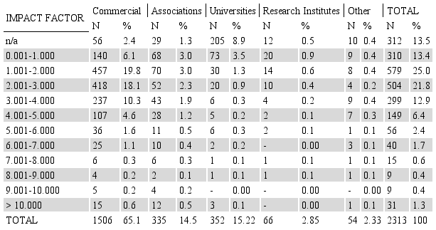 The IF of the majority of journals produced by commercial publishers ranged between 1.0 and 4.0; for journals published by associations and universities, the most frequent IF ranges were 0.001 to 3.000 and 0 to 1.000, respectively. The distribution is equilibrated for journals published by research institutes.