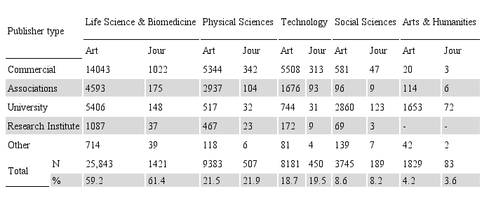 To classify the types of publishers we considered any association or society as an association while considering teaching institutions as university. Any institution focused mainly on research is a research institute. Journals that fit none of these categories but had a clear commercial focus are commercial. Journals were grouped by publishers’ owners and companies within the same group classified as a single entity. Journals which did not fit into any of these categories, were classified as other.