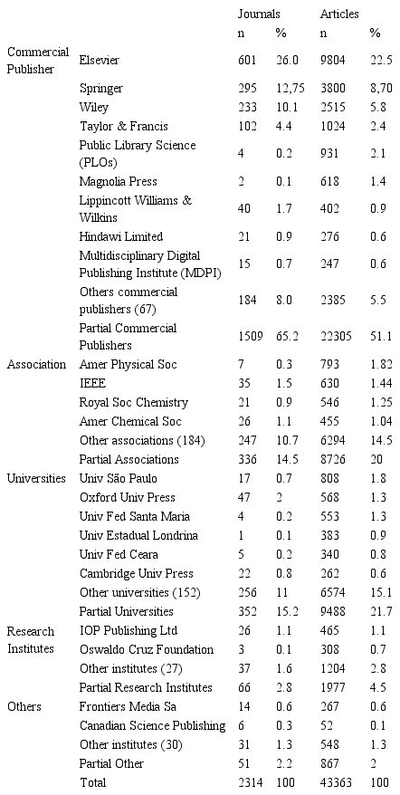 Source: The authors (2019).The commercial publishers with the most journals are Elsevier, Springer, Wiley and Taylor & Francis, groups with a strong presence in WoS. Elsevier had the highest number of journals among these publishers, with 25.9% of journals and 22.4% of articles (Table 6).