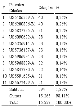 Spinak (2003) afirma que, se uma patente é altamente citada, é possível que ela represente um avanço tecnológico muito relevante, o que indica também o seu valor comercial. Nesse sentido, observou-se que entre as patentes representadas na Tabela 3, 100% delas foram depositadas no escritório norte-americano, mostrando um potencial tecnológico muito forte nos EUA, nessa temática. As patentes citadas mais vezes foram, com 40 citações (0,26%), a US5486359-A e a US6200806-B1, classificadas, respectivamente, A61K35/12 e C12N5/08. A primeira trata de preparações para finalidades médicas, odontológicas ou higiênicas e a segunda classificação trata de propagação, conservação e manutenção de microrganismos e engenharia genética.