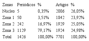 Conforme podemos verificar na Tabela 4, os 1426 títulos de periódicos foram agrupados em quatro zonas (o núcleo e mais três zonas). A primeira zona, que corresponde ao núcleo, é formada pelos cinco periódicos (0,35%) com maior número de citações, totalizando 2006 artigos citados (26,05%), o que equivale a aproximadamente 400 artigos por periódico. Já as zonas 1 e 2 contabilizaram respectivamente 23,92% e 25,05% dos artigos com citações médias. Por fim a zona 3, com 1129 periódicos (79,01%), produziu conjuntamente 1924 artigos citados, não chegando a dois artigos citados por periódico.