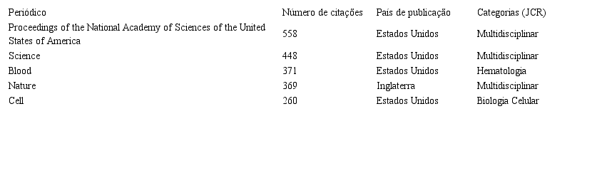 É importante destacar que, das cinco revistas mais citadas, quatro delas têm como país de publicação os EUA e apenas uma tem como país de publicação a Inglaterra. Ao longo deste estudo, observou-se que os EUA lideraram como depositante de patentes em células-tronco e o seu escritório de patentes foi o que mais recebeu pedidos de proteção nessa área, o que nos permite inferir que esse país tem um forte potencial tecnológico e científico em células-tronco.