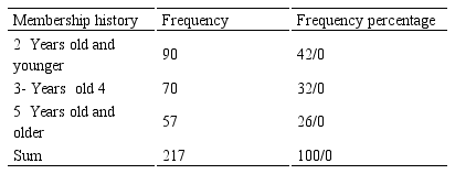 Based on table 2, the membership history of the 11-16-year-old teenage members of Shahid Bahonar public library was 42 % (2 years and less), 32% (3-4 years) and 26 % (5 years and more).
