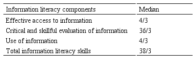 Based on the data shown in table 3, the median for effective access to information, critical and skillful evaluation of information, and use of information is 3.4, 3.36, and 3.4, respectively. Overall, the greatest median is related to effective access to information and use of information, and the least median is related to critical and skillful evaluation of information.