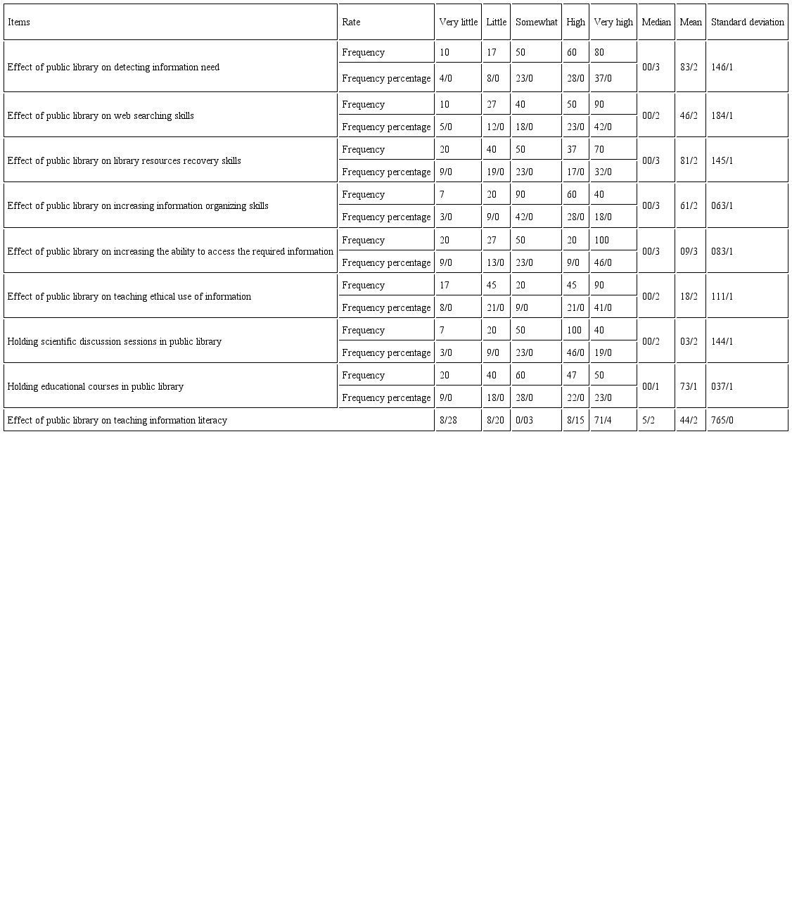 As shown by findings in table 4, the effect of public libraries on increasing the ability to access the required information and library resources recovery skills was evaluated to be average, while holding educational courses in public library to teach information literacy was assessed to be lower than average. The median of the effect of public library on information literacy of the 11-16-year-old teenagers is 2.5. Generally, the effect of public library on information literacy of the 11-16-year-old teenagers is lower than average (3).