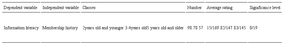 According to table 5, the significance level of 0.19 is greater than 0.05 (p>0.05). Therefore, there is no significant difference between information literacy of the 11-16-year-old teenage members of public library of Tehran 1st region (Shahid Bahonar Library) and their membership history and the above mentioned hypothesis is consequently rejected.