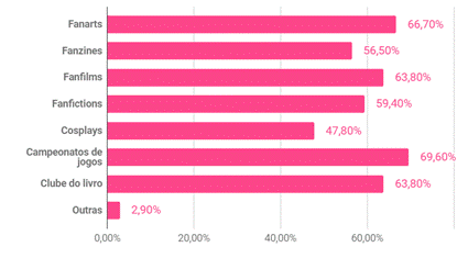 A atividade desenvolvida na maior parte das BPs é a fanfiction (60%), não por acaso, já que é a atividade mais ligada a leitura e já que é, além disso, uma atividade que exige poucos recursos de quem escreve (folha e caneta ou software de computador) e da biblioteca (livros, quadrinhos e outros materiais do acervo). Outras atividades bastante desenvolvidas são: fanarts (desenhos), com 32%; fanzines (revistas), com 28% e clube do livro com 25%. Entre as atividades listadas na opção Outras, destacam-se: concurso de leitura, torneio de literatura fantástica – jogos e atividades em torno de Harry Potter, oficinas de cordel e cursos voluntários.