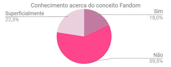 Mais da metade (60%) dos respondentes não conhece o conceito de fandom, seguida de 22% que o conhecem superficialmente. Somente 18% conhecem de fato esse conceito. Já era esperada uma alta porcentagem de pessoas que desconhecessem o conceito, pois apesar de o termo não ser novo, ele ganhou notoriedade a partir da web 2.0. Os estudos de fandom relacionados à biblioteca são ainda mais recentes. Através de sua iniciativa Center for the future of libraries, a ALA (2016) produziu uma lista denominada Trends onde listou o fandom como uma das tendências para bibliotecas em 2016, enquanto no Brasil o assunto é ainda pouco estudado nessa correlação com as bibliotecas.