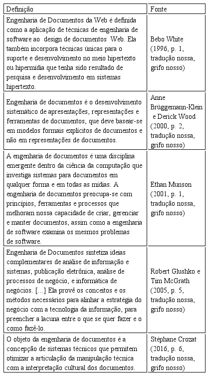 Podemos constatar que a Engenharia de Documentos tem evoluído pela contribuição que cada autor enfatizou em sua época de modo a acumular e sofisticar o conhecimento produzido na área. Como exemplos, mencionamos White (1996) (design, hipertexto e hipermídia), Brüggemann-Klein e Wood (2000) (modelos formais explícitos), Munson (2001) (criar, gerenciar e manter documentos), Glushko e McGrath (2005) (estratégia do negócio) e Crozat (2016) (manipulação técnica articulada com interpretação cultural). A intenção aqui foi apenas ilustrar as ideias dos autores a partir da definição por eles apresentada, pois suas obras são muito mais amplas e exigiriam um nível de detalhamento que não compreende a intenção do presente artigo.