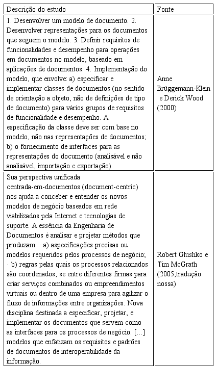 Na Engenharia de Documentos não foi identificada essa preocupação na criação de modelos de documentos nato-digitais para utilização em aplicações no futuro, pois seu objetivo maior foi de transformar documentos como interfaces de aplicações para implementar processos de negócios (GLUSHKO; McGRATH, 2005).
