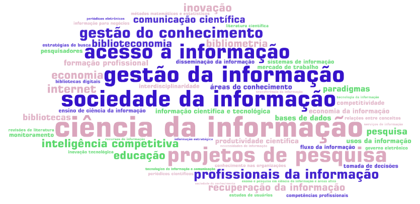 Na Figura 1 é apresentada uma nuvem de tags que permite visualizar a folksonomia assistida. Nela é possível visualizar os termos mais usados pelos usuários. Vale lembrar que o tamanho no qual o termo se apresenta evidencia sua frequência de uso, ou seja, quanto maior sua fonte na nuvem de tags, mais vezes o termo foi utilizado. Além disso, a visualização em forma de nuvem, onde palavras como Ciência da Informação, Sociedade da Informação e acesso à informação são recorrentes, permite conhecer os termos representativos do corpus segundo a perspectiva do usuário-indexador.