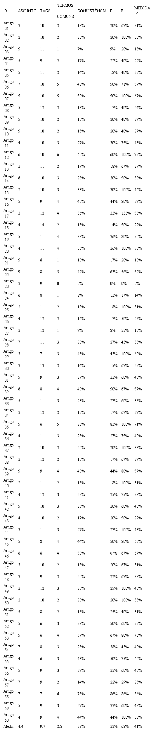 Ao realizar de imediato uma avaliação generalista dos resultados alcançados, é possível afirmar, confrontando as palavras-chave com as tags, que a grande quantidade de tags influenciou diretamente nos cálculos dos índices de coeficiente de consistência e os índices de precisão, revocação e medida F.