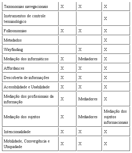 A análise do Quadro 1 permite identificar que os instrumentos de controle terminológico e os metadados foram os últimos acréscimos ao conjunto de atributos. Considerando os atributos iniciais do conceito, os metadados estão diretamente atrelados às ações dos mediadores institucionais (informáticos e profissionais da informação), cuja ação, realizada no momento do desenvolvimento dos ambientes informacionais, na elaboração de arquiteturas de informação e suas estruturas, utilizam-se da intencionalidade para a definição de metadados. Nesse contexto, eles são capazes de favorecer diferentes aspectos da encontrabilidade, como a navegação e o mecanismo de busca, além da possibilidade de uso em estruturas de wayfinding, culminando na descoberta e melhoria do acesso.