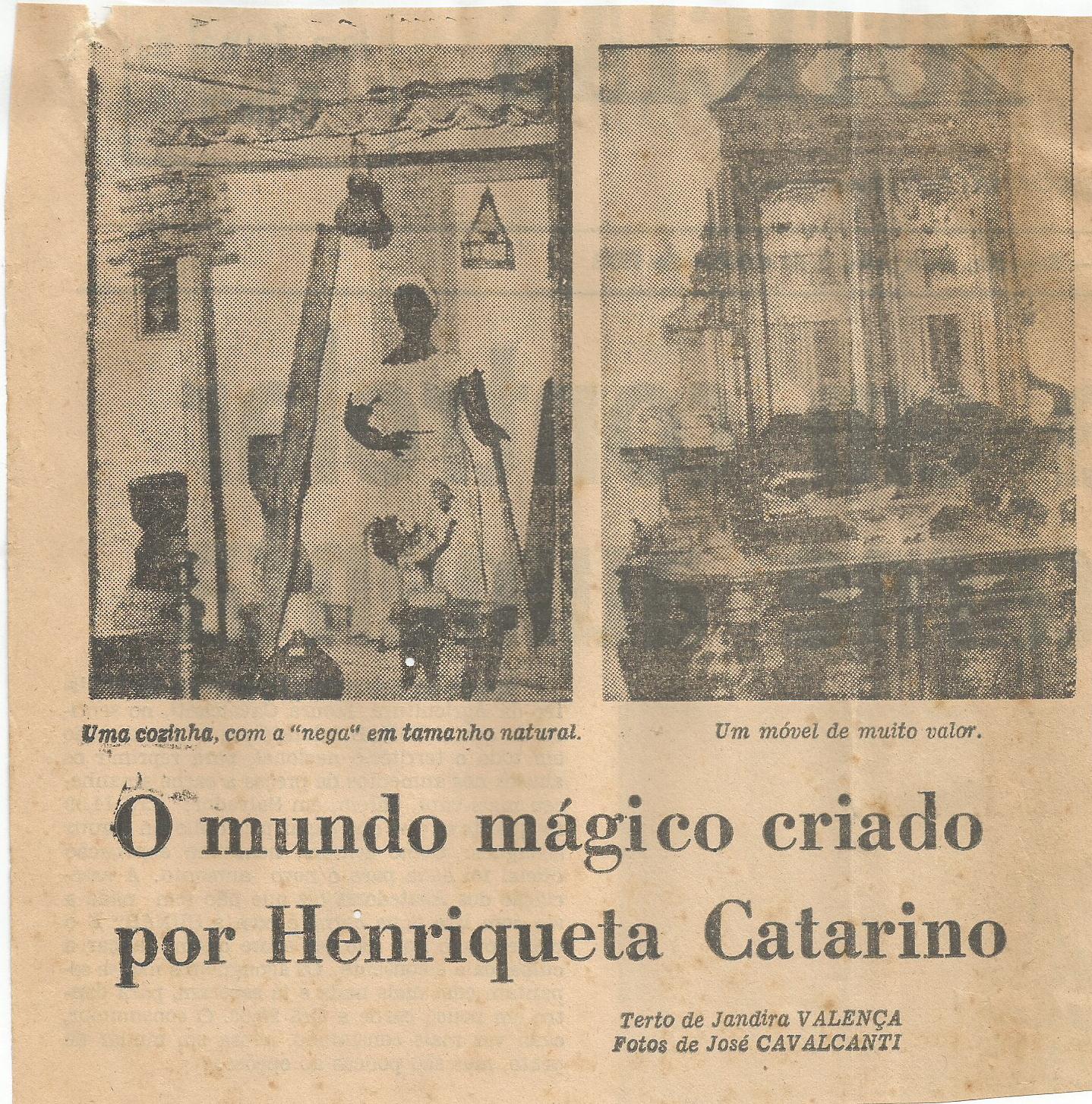 Fonte: A Tarde (1957).Em estudo recente concluímos que a constituição da coleção de artefatos populares se deu paulatinamente mesclando trabalhos manuais resultantes dos projetos assistencialistas, apresentados em mostras temporárias (para venda em bazares realizados pela Associação de Senhoras Brasileiras, no Rio de Janeiro)[41], com trabalhos de outras artesãs (ou artesãos) não vinculados diretamente aos projetos, porém representativos da artesania regional. Caso, por exemplo, de pequenas esculturas executadas por duas irmãs (Ana e Olegária de Almeida) da região de Jacuípe (litoral norte da cidade do Salvador), caracterizadas, por Marieta Alves, a primeira secretária de Henriqueta Catharino no IFB[42], como “tipicamente populares”[43]. A conhecida benemerência de Henriqueta, sua obra e o círculo social do qual participava - e contava, para desenvolver os projetos - não descarta a probabilidade de que ela mesma comprasse trabalhos artesanais motivada pela ajuda caritativa ou dar incentivo além de possíveis presentes ou ainda pelo próprio gosto (CERÁVOLO, 2020).