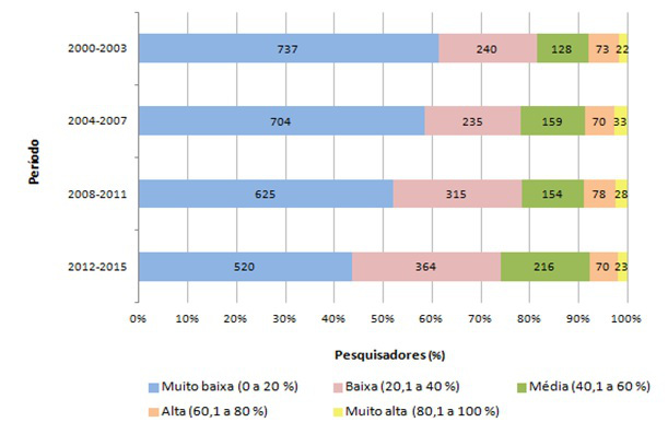 Importante ressaltar que, a despeito desse dado alarmante, é clara a redução no número e no percentual de pesquisadores bolsistas da faixa de muito baixa adesão, que passou de 737 pesquisadores (62%) no quadriênio 2000-2003 para 520 pesquisadores (44%) no quadriênio 2012-2015. A redução observada nesta faixa acompanha o aumento em outras duas faixas, de baixa e média adesão, o que sugere que, nos últimos anos, parte desse grupo seleto de pesquisadores mudou sua práxis e incorporou mais os periódicos de acesso aberto como meio de difundir suas pesquisas.