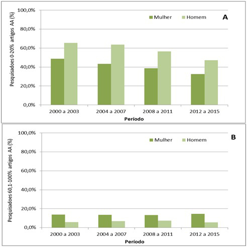 É possível observar que entre os pesquisadores com perfil de muito baixa adesão (0-20%), os homens predominam. Porém, entre aqueles classificados como de alta/muito alta adesão (60,1 a 100%), observamos que as mulheres predominam. Isto significa que mulheres publicam mais em AA que os homens, ou seja, 14 em cada 100 mulheres publicam nesta faixa de adesão, enquanto cerca de 6 homens em cada 100 têm o mesmo desempenho.