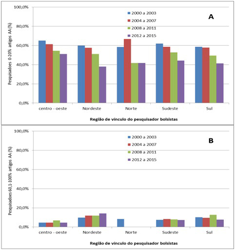 O Gráfico 3A demonstra que a fração de pesquisadores com perfil de muito baixa adesão (de 0 a 20%) praticamente não difere entre as regiões. Observa-se também que a fração de pesquisadores com esse perfil diminuiu ao longo dos quadriênios.