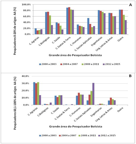 No gráfico 4A, observa-se que, entre os pesquisadores com perfil de muito baixa adesão, predominam aqueles das Ciências Exatas e da Terra, aqueles de outra grande área não especificada, aqueles das Engenharias, aqueles das Ciências Biológicas e aqueles da grande área de Linguística/Letras/Artes, decrescentemente. Já na faixa da alta ou muito alta adesão (Gráfico 4B), pesquisadores das Ciências Agrárias e das Ciências Sociais Aplicadas predominam. Nesta última grande área, observa-se um evidente crescimento na fração de pesquisadores que publicam nesta faixa de adesão no decorrer dos quadriênios.