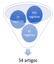 Como critério de exclusão, eliminaram-se as categorias Computer Science Information Systems, Computer Science Interdisciplinary Applications, Health Care Sciences Services e Medical Informatics, que ainda apareciam atreladas aos resultados filtrados na opção de análise dos resultados na WoS. Por fim, obteve-se o total de 61 artigos. Após essa etapa, excluiu-se mais um artigo, pois o assunto principal não era condizente com a temática a ser abordada, e excluíram-se mais sete registros por serem duplicações, perfazendo o número final de 54 artigos[6] (Figura 3).
