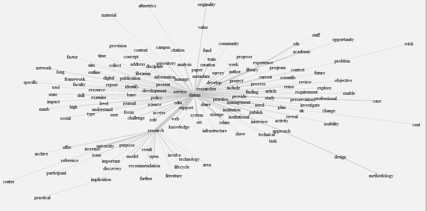 Vale ressaltar que, nos 54 textos, a palavra academic ocorre sempre próxima ou associada a librarian (bibliotecário) e a library (biblioteca), entretanto, nem todos os textos apresentaram o termo data librarian. Portanto, pode-se inferir, a partir desses indícios, que a tarefa de gerenciar dados de pesquisa vem sendo cada vez mais atribuída ao bibliotecário que atua em bibliotecas universitárias, apesar de não se limitar apenas a este.