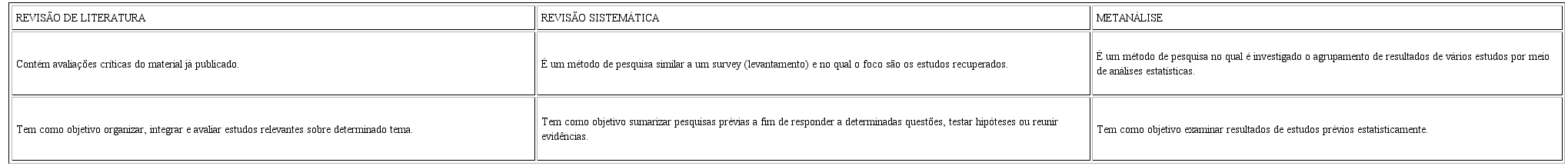 A revisão sistemática, necessariamente, define critérios de busca específicos, tais como bases de dados ou outras fontes de informação, escolha de descritores, abrangência (ano, local de publicação, idioma etc.); além disso, tem foco principal na apresentação dos dados referentes a esse processo sistemático de busca, em que se discriminam quantos registros foram recuperados, quais os estudos realizados, assim como demonstra as lacunas identificadas na literatura. Já as metanálises analisam estatisticamente o agrupamento dos resultados de estudos prévios sobre uma temática (HOHENDORFF, 2014).