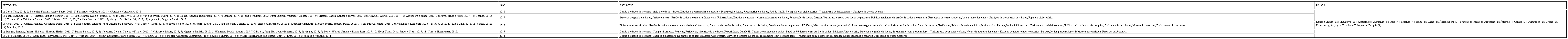No Quadro 3 a seguir, dispõem-se os registros recuperados na base de dados Web of Science. Há textos sobre gestão de dados de pesquisa e sobre curadoria de dados, muitos relatos de experiência e capacitação dos bibliotecários para atuar nesse novo nicho, pesquisas relacionadas ao estabelecimento de padrões e políticas de gestão de dados, estudos métricos e citações relacionadas aos dados, ciclo de vida dos dados e da pesquisa etc. Entretanto, em poucos dos artigos recuperados na base menciona-se de forma explícita o termo bibliotecário de dados, com ocorrências mínimas, portanto, denotando bastante atenção e foco nas práticas e processos para a implantação de serviços em gerenciamento de dados científicos.