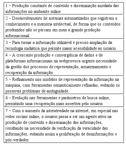 Ao mesmo tempo em que tais avanços trouxeram vantagens, pode-se afirmar que vieram incertezas, cujas consequências são difíceis de prever. Ramalho e Ouchi (2011, p. 66) assinalam que o grande volume de informações disponível é apresentado como desafio contemporâneo, uma vez que torna-se necessária a “singularização contextual na reconstrução do conhecimento, possibilitando a contextualização das informações a partir de requisitos de pertinência e relevância”, auxiliando na recuperação de interesse do usuário.