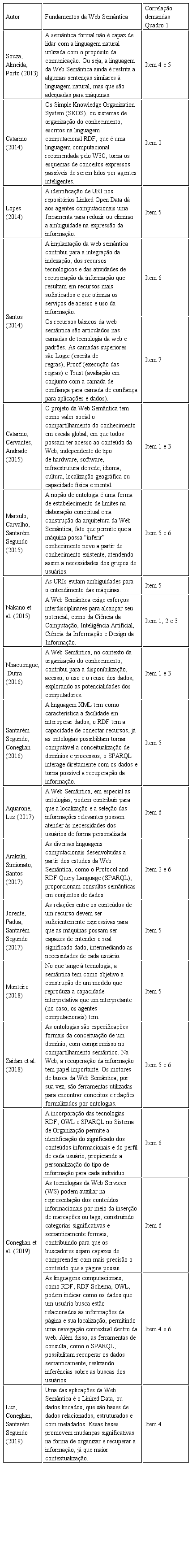 Visando correlacionar as demandas da SI, sintetizadas no Quadro 1, com os elementos (fundamentos, princípios e ferramentas) da Web Semântica, buscou-se na literatura os insumos que poderiam contribuir na busca de soluções para as sete problemáticas apontadas, conforme descrito na próxima seção.