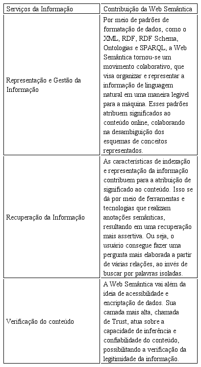 Buscando complementar a análise e indicar de forma mais assertiva os pontos de convergência buscados, o Quadro 3 exibe de forma sintetizada essa correlação. Para isso, as sete necessidades indicadas no Quadro 1 foram agrupadas na primeira coluna em três serviços da informação (Representação e Gestão, Recuperação e Verificação) e, na segunda coluna, estão as conclusões da análise sobre a contribuição da Web Semântica para tais serviços.