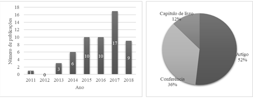 O termo “patrimônio inteligente”, referindo-se a uma abordagem da preservação patrimonial em sintonia com os projetos de cidades inteligentes, começou a aparecer na literatura a partir da década de 2010, sendo que as primeiras tentativas de definição do termo datam de 2013. Trata-se, assim, de uma área recente, conforme apontado no gráfico dos anos de publicação dos documentos, na Figura 1. Na mesma figura, é também possível visualizar os tipos de publicações encontradas: 29 artigos (52%), 20 trabalhos apresentados em conferências (36%) e sete capítulos de livros (12%).