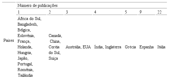 Com relação aos países de origem dos autores, 12 dos 22 países identificados encontram-se na Europa, sendo a Itália o local onde originam-se o maior número de estudos. Para além da Europa, encontram-se representados a Ásia, em maior proporção, e em menor, a América do Norte, a Oceania e a África, mas não há nenhum trabalho da América Latina, conforme a Tabela 1.